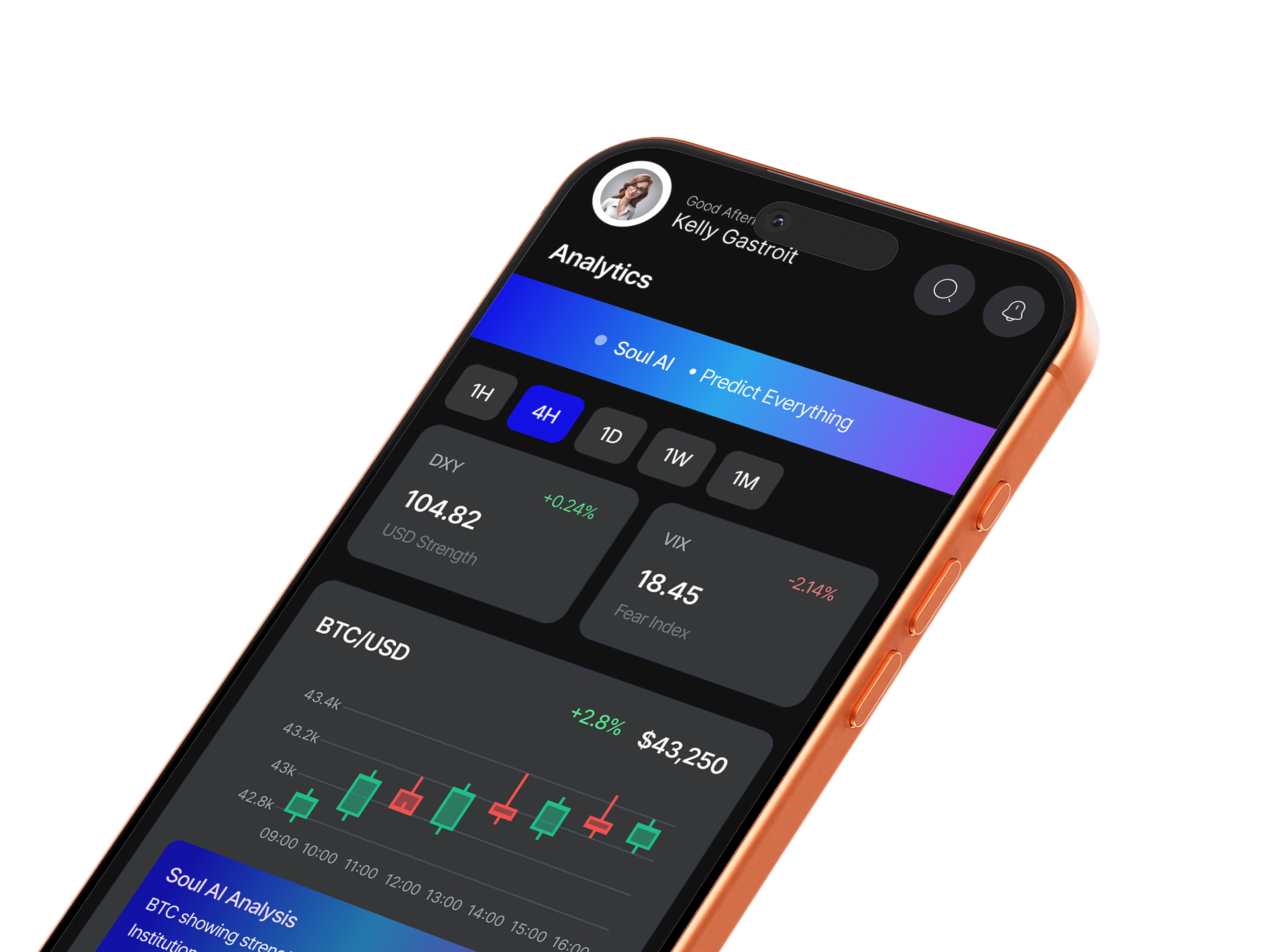 The Analytics screen ties it all together. Monitor the US Dollar strength (DXY) and market fear index (VIX) alongside your symbol's price action — so you always see the bigger picture. Soul AI cross-references every data point in real time and delivers a single, clear analysis: what's driving the move, what institutional behavior is detected, and what the current risk sentiment means for your asset. Context-first. Always.